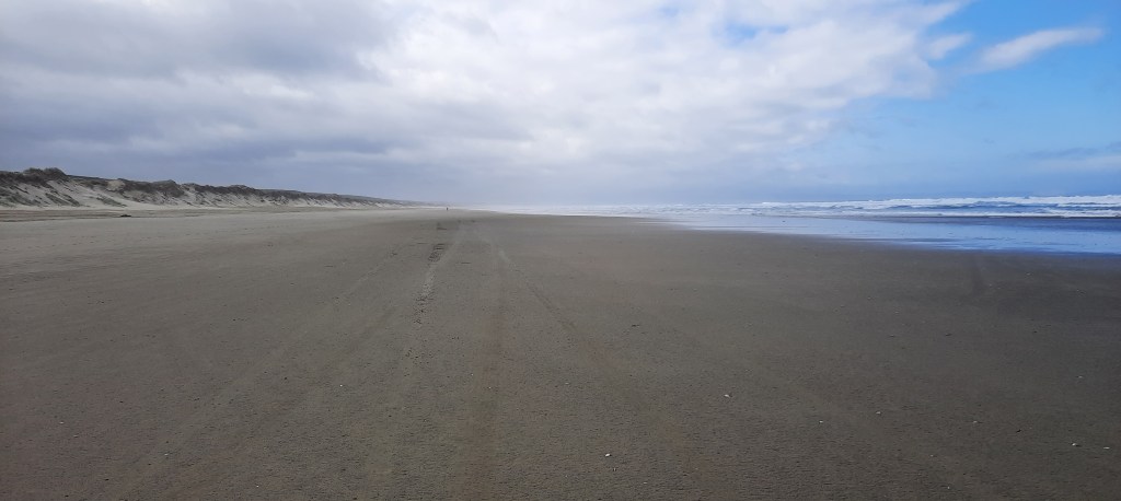 Being in a B&B it would be rude not to partake of the breakfast. Cups of coffee and filled up nicely I could be out of the door just after 8am. We had seen Darnay setting off already and I wasn’t far behind. Today would be another 30 odd km, somewhat daunting after days of the same but equally it was the final day of 90 mile beach and a milestone was in sight – Ahipara. It was a lovely morning for walking. The breeze was cool on my back and the dappled clouds kept the sun at bay. High tide is not expected until around 1pm so there was plenty of time to take advantage of the harder sand, hopefully all of the way to Waipapakauri where I would rendezvous with my trail angels. This first stretch is 17 km which I hope to do in 3 hours.