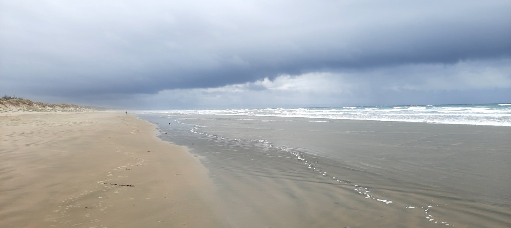 After an hour break I reemerged onto the beach for the final 14 km stretch to Ahipara. The clouds were getting ominous and I could see showers in front and behind me. I reached Darnay as a few spits were falling and we walked the final stretch together, with Ella maybe a km behind us. We had a good stride together and it helped chatting to pass the time and make the walking easier.