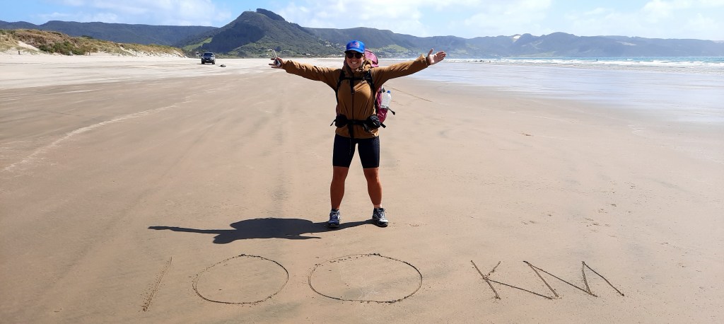 The beach swung around to a more southerly direction and we were greeted by a strong, direct headwind for they final haul into Ahipara. We certainly had to work for these last few kilometres however with each step we were closer to the magical 100 km mark. Paulette had written notes of encouragement in the beach however the wind blown sand ruined that so we made our own to mark the accomplishment. 90 mile beach and 100 km done and dusted.