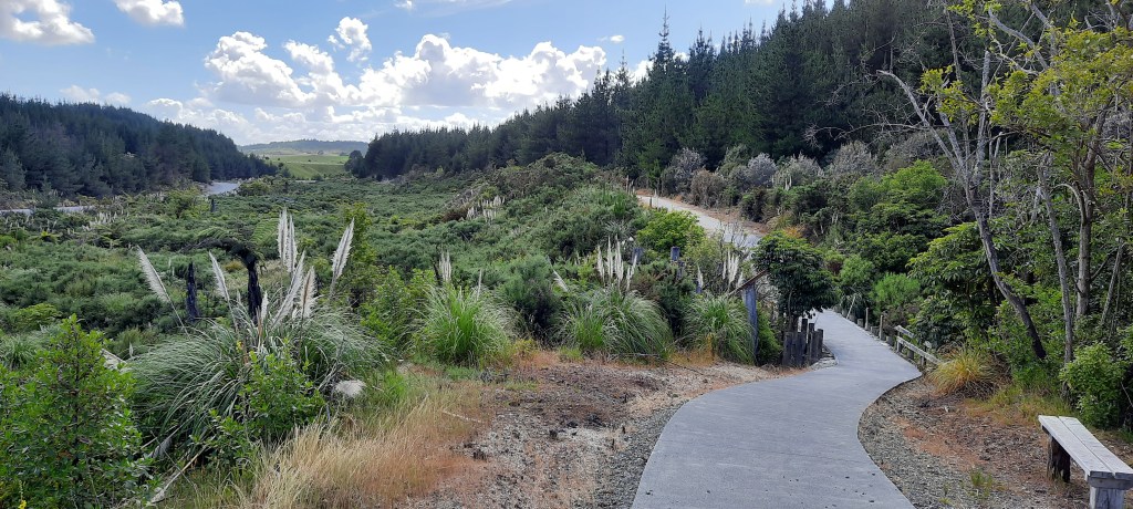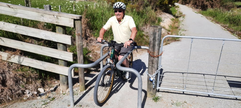James the night manager at Left Bank had breakfast ready by 7:30am for myself and the other couple in the backpackers. I must say his cooked breakfast was delicious. I had a very quick video call with the Martens in Denmark when Wenz and Phil arrived outside in their car. I immediately thought this was strange as I wouldn’t have thought his bike would fit in the boot of the car. I had expected them to arrive in the ute. They crossed the street for greetings and I asked Phil did he have his bike? “I thought we were walking” came the reply. Woops seems we had wires crossed. I was anticipating cycling to Opua and they had anticipated walking. Cycling it would be so a quick call was made to Top Trail and shortly after Phil had his very own bike for the ride to Opua. In its heyday in the 1950’s there were six trains each way between Auckland and Kaikohe every week. Today nothing remains of a station although we have the land the tracks ran upon to be thankful for – this will provide our trail as far as Opua. Departing Kaikohe, the trail was flat and passed behind town through farmland and was lined with totara and a surprising number of peach trees. The fruit is yet to ripen – riders in the coming months will have a trailside feast.