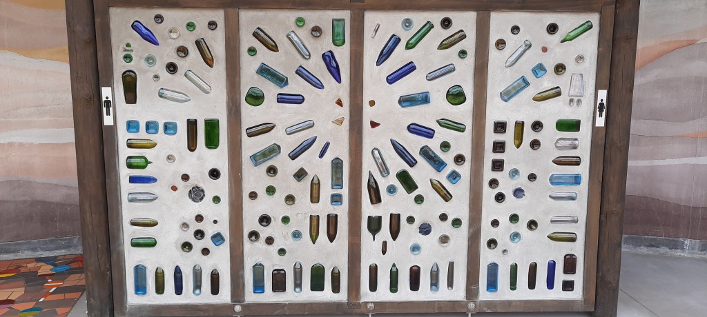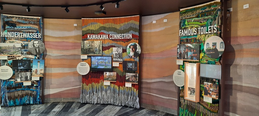 The town is also famous for its Hundertwasser toilet block, designed by Austrian artist Friedensreich Hundertwasser, who was a resident of the town from 1975 until his death in 2000. In October 2020 the town opened the new Hundertwasser centre which houses the library and an information centre about the artist. Its well worth a visit, to see examples of his art, philosophy, the mosaic toilets and the beautiful tinted rammed earth walls.