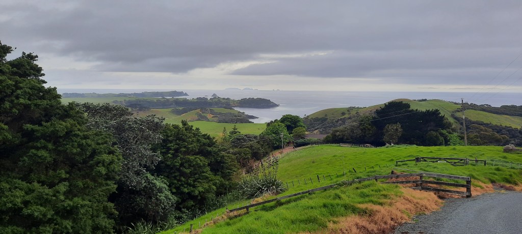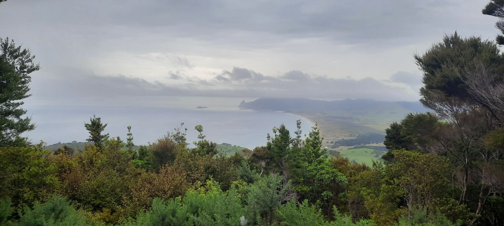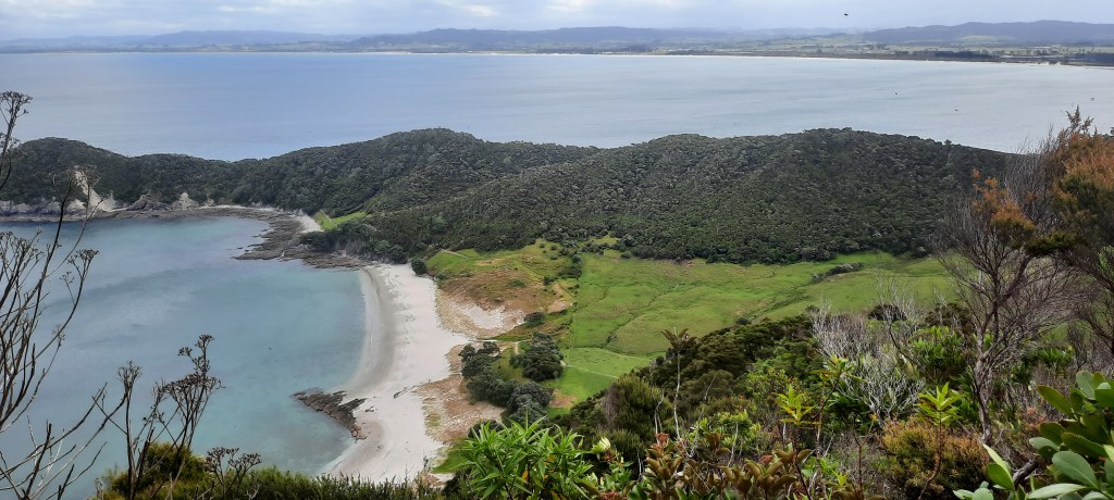 Ros and Hugh gave us a delicious breakfast this morning. One for champions; fruit cereal toast bacon eggs tea and coffee. Their visitor book is full of glowing acknowledgements from grateful hikers. We all bundled into their van and set off across to the other side of the estuary. This morning they were going into Whangarei so rather than row us across with a high tide we were driven. There were hugs all round as Jazz was accompanying them into the city to see a Dr about her foot. We three set off up the road leading to the Kauri Mountain track. Presumably it was covered in kauri trees in the past before they became houses and furniture. Fortunately there are still some specimens planted so it can retain its title. Shortly up the road a lady is standing at a letterbox looking into the paddock. She directs our gaze to a horse and a white infant foal, a matter of hours old. She was waiting to see if the mare would let it suckle. Apparently the horse was too young to have a foal so something went awry a year or so ago. The view as we climbed ever higher was widespread. We could trace the coast we had previously walked, see the Poor Knights Islands and admire the lifestyle blocks that adorn the mountain. I say adorn as every block is well tended and features a fine house. Private signs abound. The final track to the summit is through a narrow slash of gorse then we make it to the trig. For the first time the rest of the day unfolds before us – Ocean beach and the daunting outcrop of the Whangarei Heads. The track descended through bush where a road led us via a farm to the start of the beach. In contrast to the northern side of the mountain, the farm had gorse everywhere and the fences were mostly nonexistent. Once on Ocean beach we had a 6 km to get to the other end. The tide had been high and was going out however the hard sand was still at the waters edge. The water was crystal clear with uniform waves that every so often would surprise us by washing further up the beach. I got my shoes soaked at least three times. After all what’s the TA without wet feet?! We arrived at the Ocean Beach settlement before midday and stopped at the TA campsite for lunch and water. We had been debating whether to stay here the night or go across the heads. As we were early in the day we all concurred that we should get it out of the way this afternoon. It is 7.5 km and takes 5-6 hours so it will be lateish by the time we get to camp thsi evening, wherever that may be.