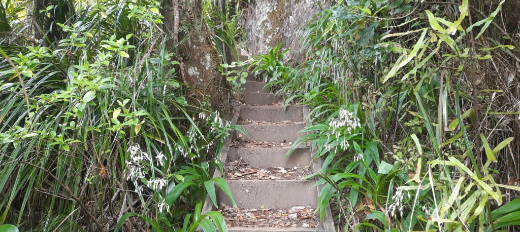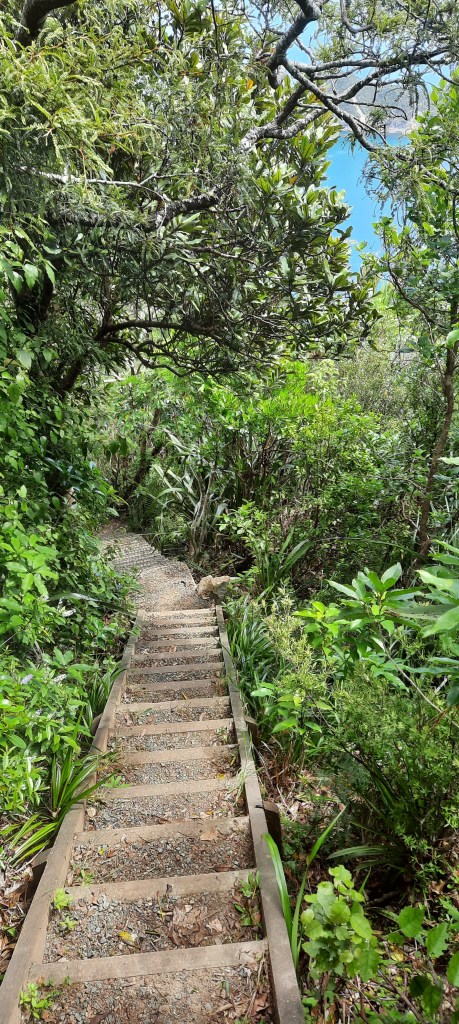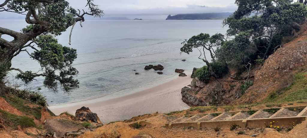 Eventually we reach the ridge of Matariki/Mt Lion at 395m. From this summit, the trail descends steep stairs. There are 1,500 of them – all care being taken with knees and not falling down them. On the way down, the striking ivory crescent of Smugglers Cove made a great distraction from the many steps.