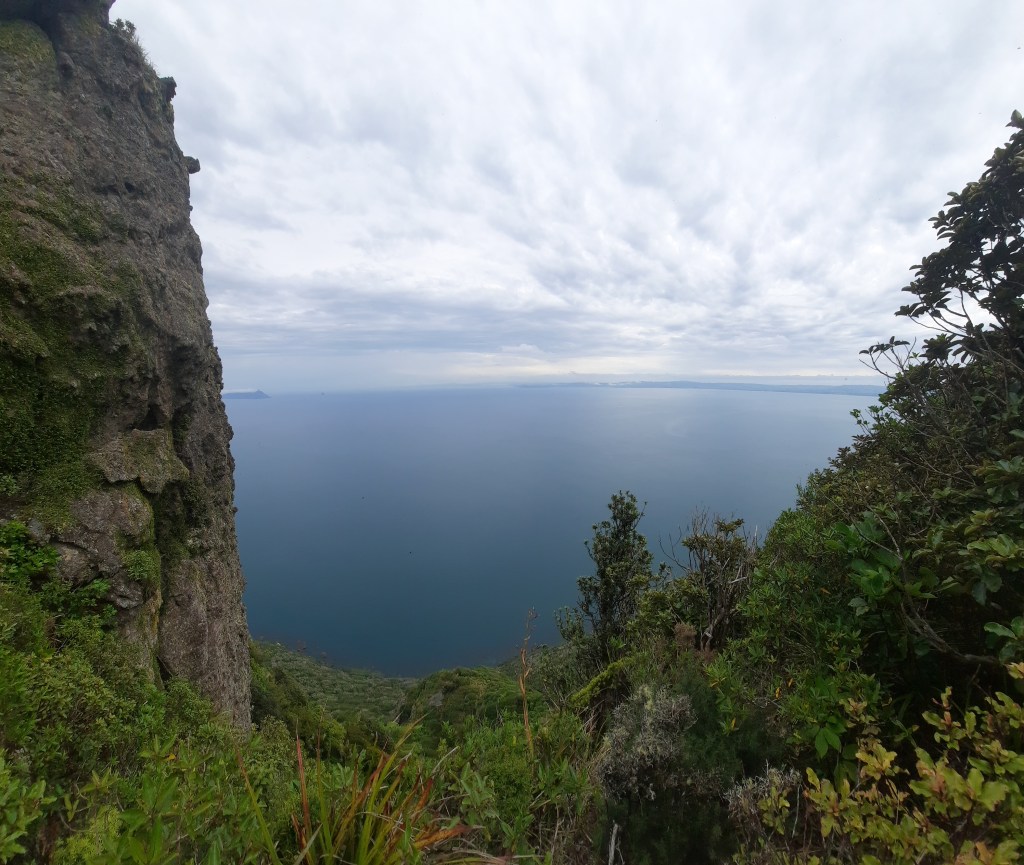 The rock pillar of the Te Whara summit rises a near-vertical 476m above the sea. The Te Whara Track is known as a challenging day walk that follows a 700-year old Māori trail past remnants of Second World War paraphernalia, through thick coastal forest. From Ocean Beach the track climbs steadily uphill across open grassy hillside. For most of the way there are no switchbacks, so it was a challenging ascent. I had drunk a couple of litres of water during lunch and it was all coming out as sweat. On our side was an overcast day and a breeze occasionally. Fiona and Tony were taking the incline better than I was which made me think about how fit I had been when I crossed this same track three years ago. I had been over four months into the walk however. That time it was somewhat difficult, this time it was right out tough. At the many stops to catch my breath, there were clear views out to sea. We arrived at a clearing with picnic table from where you could