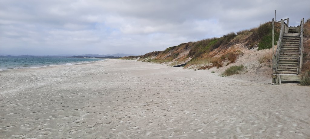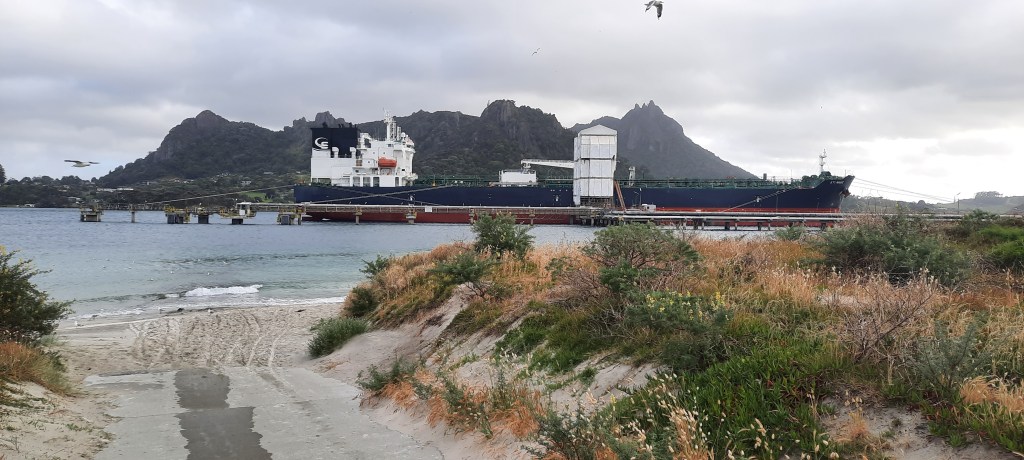 I did sleep very well last night. It rained most of it but I did not care less as my tent proved it is waterproof and I was snugg as a bug. Even the toilet light outside didn’t bother me. The rain was forecast to end by dawn. It persevered until just before 7am when I got up and packed down my tent and belongings. Blair sent a text to reconfirm our boat ride and we met him spot on 8am at the bay below the campsite. He backed the boat down to the waters edge with his tractor, heaved in our packs and we climbed aboard, checking in with tracer app and donning life jackets. We reversed straight off the trailer and were soon zipping across the Whangarei harbour to Marsden Point on the opposite side. The $20 per person ride took all of 8 minutes but saved an enormous detour via Whangarei to complete the same. In his other job when not taxiing TA walkers, Blair retrieves the logs that have fallen from ships into the harbour water. See as the ship is being loaded with logs sometimes they call overboard. Blair gets a call, anytime of the day or night, and goes to drag them back to shore. Fascinating that that is a job. At Marsden Point there is a pontoon that we step onto. Didn’t even have to take off shoes or have them get wet. From there the trail follows the security fencing of North Port and the oil refinery. There are a mountain of timber logs ready to depart overseas along with a massive mountain of wood chips, so large that a digger is perched on top forming the mass. The trail passes under the pier to which an oil tanker is secured, discharging its crude. Out to sea another larger tanker is being accompanied in by tug boat so I presume that this one is due to sail shortly. As I round the corner to Bream Bay the southerly wind hits. 50kmh gusts are forecast today and if this isn’t that blustery I don’t know what is. The tide is high making walking difficult so fortunately there is alternative above on land – a pipeline road that leads the 5 km into Ruakaka. I reach Ruakaka at 9:30am and head straight to a cafe, the first I can find. Two Birds cafe satisfied with flat white and smashed avo ciabatta with bacon. Oh man did it taste wonderful. And a proper coffee. Replete I did a little grocery shop then caught a taxi to my friends Ange & Eppie where I stay tonight. Everything washed I feel myself again. Tomorrow onto Mangawhai via Waipu Cove and some magnificent coastal tracks.