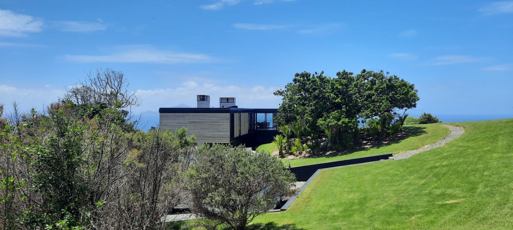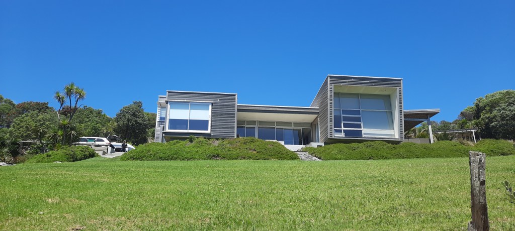 From the main road the TA trail follows a private driveway further up towards Bream Tail. It starts as tarseal then becomes white chip, two signs of affluence I believe. If you have a long tarseal or white driveway you’re not short of a penny. That’s my two cent opinion. The track dips across farmland then rejoins a tarseal road (see). The TA trail indicates to go down a hill, across a swamp and back up the other side. I did that last time so instead I follow the road as it loops around to rejoin the TA on the opposite side of the valley. I want to see what other TA walkers don’t. What’s around the corner? Well as you may have guessed it’s more architecturally engaged houses with unhindered views out to sea.