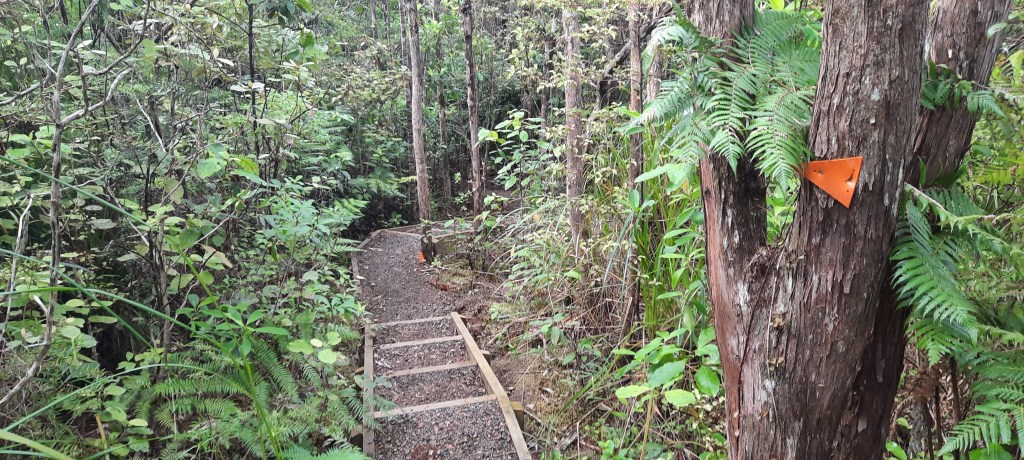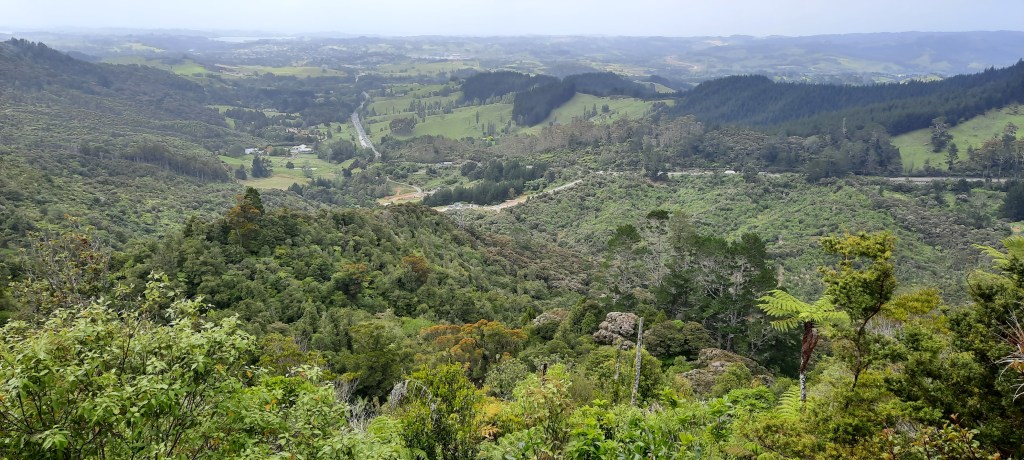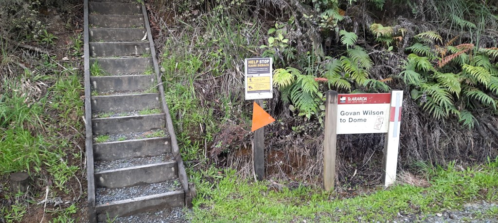 The Dome Forest track skirts the tops of the hills all the way to Dome Valley. Regenerating bush of podocarp and broadleaf species with lots of ferns and nikau. Also a stand or two of kauri. You can always tell where the kauri trees are as DOC improves the track conditions immensely usually with raised boardwalks. The track is the usual up and down over the top of each peak. I pass the trig and soon after reach the Dome lookout platform for a view of SH 1. The road had already interrupted the peace of the forest. I could hear sirens and angrily rooted horns from way back. There was a large totara tree beside the platform which an opossum ran out of when I approached. By the time I reached the Dome summit where the cafe is, it was just after 11am. I had smashed it in 4 hours however this also meant that I would need to keep going to Puhoi, a 40km day. So I filled my water and pushed on.