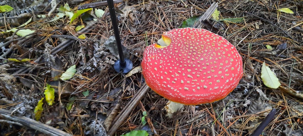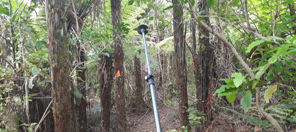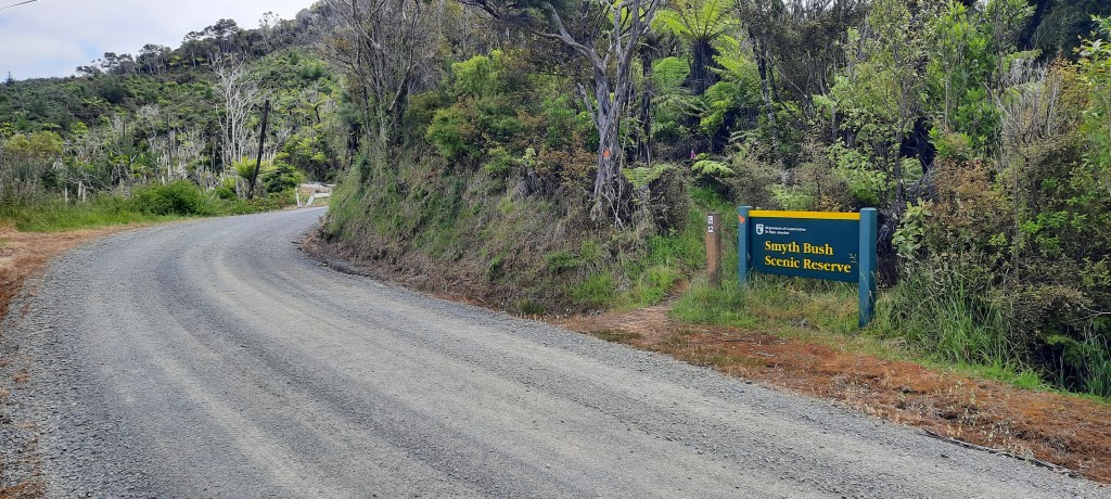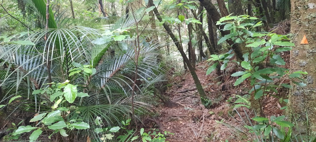 If you were wondering, Govan Wilson is a road. It is about 3km long and connects the Pakiri section to the Dome section. Perched high above Matakana the ridge has many properties which have widespread views either South or North. It’s location on the trail makes it a popular overnight stopover for TA walkers. I’m out the door at 7am as it is supposed to be a 6-7 hour hike to Dome Valley where I can camp at another trail angel place. The Dome track starts from the road and into scrub then pines before reaching regenerating bush. It is somewhat sad to say regenerating i.e. the original bush was felled for farmland. However fortunately it is growing back here albeit with limited varieties to the original. I pass by a giant toadstool, its as wide as my outstretched hand, what’s that about 20cm across. There hasn’t been any hikers ahead of me. In the early morning you know if you are first along the track because you are constantly walking through cobwebs. I’d be the Adams Family relative with a head covered in spiders. To try and combat wearing every cobweb I would raise my trekking pole up to catch them first. It’s my Dalek move. Very successful when in operation however due to the terrain it cannot be employed all of the time so I will end up having to wipe spiders and webs off fairly constantly. I have stopped to take a photo of the track and suddenly a guy appeared. Gave me a hell of a fright. The guy is another hiker, Johannes from Germany (been in NZ since last Nov) and the first time I have met him. We walked for a while him bashing through the bush in front. It was quite good as I only needed to follow rather than look for the track. Although he had gotten lost yesterday and added 5km onto his walk, so maybe not the best person to put your trust in. We reached a stream where he stopped for water and I didn’t see the again today. The track followed the Waiwhiu stream for over a km where you crossed at some large rocks. Then it ascended quite steeply on a pine forest road before entering the Dome forest.
