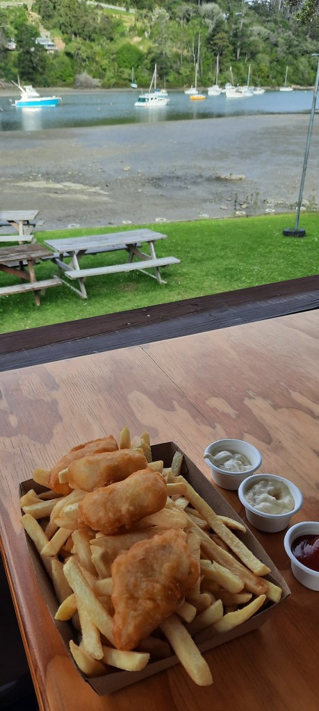 At the end of Waiwera beach I skirt a tumbledown wall and push through the undergrowth to get onto the sand. The tide is continuing to ebb and I hope that it will be sufficiently out for me to walk entirely around the coast to Orewa. The alternative is to walk SH1 which has zero appeal. The first beach consists primarily of crushed shells, pretty to look at but tougher to walk upon as it is not firm and your feet slide downwards with each step. Fortunately it is not long before I reach a rocky ledge of ancient lava. The geology along here is fascinating. Sandstone and mudstone cliffs show layers clearly and these same formations continue all the way into Auckland. It’s called Waitemata sandstone. The folds and dips are clearly evident and at low tide they extend out to the sea in dead straight lines. Keeping up the circuit of the coastline there are bays sand and rocks to negotiate. Often I’ll need to dip into the water to clear a cave or fingers of rock that are not yet high and dry. It’s all part of the fun. Under several cliffs there are fallen rocks some the size of a chest freezer and the tide required you walk around them. On one occasion I had literally just passed by when a sizeable piece fell from the heights. By the sound of the clunk when it hit the bottom it could easily have been a head basher. I was relieved with my timing at that point. Other sections required stepping from rock to rock. Good ankle workout as long as you don’t slip. Fortunately for the most part the rocks along here were not slippery. Passing Hatfields beach I was soon at the north end of Orewa. Time for an ice cream (choc and Passionfruit) before walking down the road to the south end. Here the trail goes right through Silverdale which I have walked before so I kept to the main road up the hill and past the fire station which was always a landmark for me as a child when we drove north. Past the Whangaparoa turnoff and down the hill to rejoin the trail at Tavern Road on which the Wade Tavern is located. This turned out to be the start and finish location of the Hells Angels ride today. Unfortunately just a few bikes remained from what would have been a spectacular sight a little earlier on. Who knows I could even have asked for a lift on the back of a Harley – that’d be a great way to ride the trail. I was now trudging up the East Coast Bays Road and nearing 5pm I reached the Stillwater turnoff. The road down to Stillwater is notorious for being unsafe. It is windy and there is no berm or safe verges. Sadly there is also no public transport as an alternative. So I reload the Uber app on my phone and soon after a Prius pulls up for the ride down to Stillwater. Conveniently the driver drops me at the fishing club so I’m I go for a beer and fish n chips. The friendly locals and staff are great fun and very encouraging of my walk. It is the perfect end to an excellent day. No hold on, not just yet. After my meal I continued around the road to the holiday park. The owners Maxine and Roy provide a hall building with mattresses and a hot shower token to TA walkers for free. Amazing. Now it’s the perfect end.