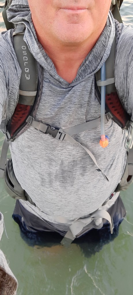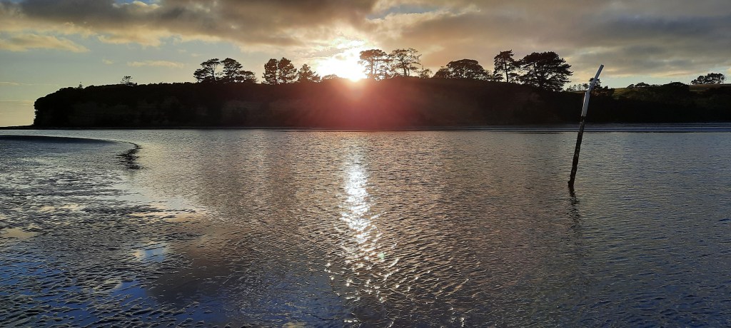 Low tide is at 6:12am this morning – the best time to be crossing the Okura river which is approx four km from the holiday park. That means I should allow about an hour to get there with a leeway of 30 minutes for low tide. For me it’s a compromise between getting up early and getting to the river too late and having the water too high. I decide a 5:30am alarm is early enough and I was on my way out of the camp by 5:50am. It had rained heavily for much of the night. Fortunately I was indoors and even better it had passed through by the time I departed. The wet ground and dripping trees didn’t bother me as soon enough I’d be waist deep or worse in water anyway. The birds were making their morning chorus, the honeysuckle was extra sweet and the sun was rising over the bay. It could not have been more enlivening. After a km or so I reached the mudflats and as the tide was so far out I could make a diagonal crossing in a more direct route towards the crossing point of the river. This would reduce the distance walked by following the coast proper and get me there quicker. The mudflats were hard sand and made for quick walking whilst dodging the triangular depressions made by stingrays. Sure enough I reached the fourth white marker from the river mouth at 6:30am and pretty much just wader straight in. I was hoping I had the correct spot to cross at. I had moved my electronics from the hip pockets and if my tent etc at the bottom of my pack got wet it wouldn’t be the end of the world. Still if it did get above my hips I would probably lift the pack to my shoulders. The water was shallow, under my knees until about three quarters of the way across when it dipped down and the water climbed to my waist. That was as deep as it got and five minutes later I was across to the opposite side. My shorts were wet through but they will dry quickly and completely while walking.