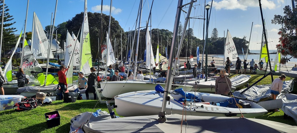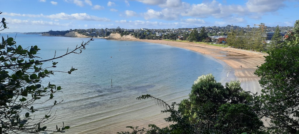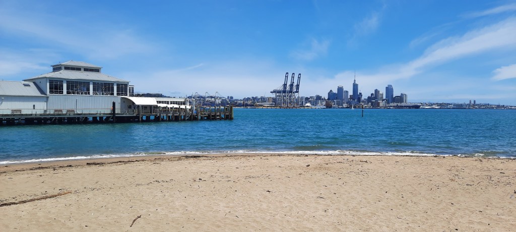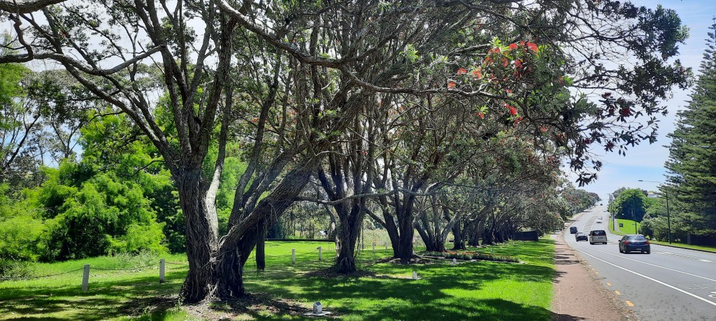 I clambered up the bank and low and behold there was a person standing on the path. Gave me quite a fright. It’s an Argentina guy out for his morning run. His friend has just started the TA from Cape Reinga. Who knows might meet him along the way. The runner made a very long run this morning as I bumped into him again twice down the North Shore. The trail follows existing paths through the Longbay Park with the option to walk along the clifftop or along the beach. I’d done the top walk before so opted for the beach as the tide was still out. The high cliffs feature the same sedimentary strata like further north yesterday. They are also home to the Longbay pigeon hapu who were cooing and flapping as I walked beneath. There were a good number of people already on the beach doing morning walks, walking dogs, metal detecting and a couple of people standing prone staring – not sure what they were up to. Climbing above Longbay onto Cliff Road you get to appreciate the spectacular views out to the gulf and the magnificent homes that surely cherish the view. At Torbay it was going off with a youth sailing regatta about to commence. The place was chokka with kids, parents, yachts, sails, flags and other trappings like Audis and BMWs. Up again I went over to Brown’s Bay and from there followed the coast around to Mairangi Bay. The surf club had a kids event on, little nippers and parents having a lot of fun with beach activities. Again I walked the coast track which I think is a man-made storm water pipe, perhaps. Past lovely Campbells Bay (seafront homes with a swimming pool!) the track ran out and so I continued clambering over the rocks. It was getting a bit dicey with the tide by this time however the sea was clear calm and warm so I spent most time sloshing through the water. Before Castor Bay I ascended the Kennedy Park stairs and met Ben at the top. I ditched some of the weight from my pack in his car and Ben joined for a walk to Castor Bay. Next stop was Milford with its pretty marina then I finally took a break to get a coffee in Milford village. Refreshed from the break I was soon walking through Takapuna. By this time I thought the tide would be in so elected to walk the road to Devonport wharf. I made a detour to an adjacent hoping to see friends Carol and George Spence. Sadly they were not there but we had a nice chat on the phone regardless. Although I have not seen them for years and our paths are different since I moved from business events I hold our friendship dearly. Further down Lake Road I spotted a barber shop with empty chair and crossed the road immediately for a haircut. Now no hair and no beard. Good times. Streamlined and walking faster I was soon under the pohutukawa on Memorial Drive. This avenue of 28 Norfolk Island pines is a commemorative planting established in 1952 to honour Devonport’s sons lost in World War 2. The western side of Lake Road is flanked by a row of pohutukawa. Ever since Milford entrepreneurial families have been selling Christmas trees, the live variety and doing a roaring trade. I love the personalised signage like ‘Phoebe and Lukas Christmas Trees for sale’. And there would be a couple of kids sitting in the front yard dispensing trees. The last one in Devonport was particularly flash with strawberries and a BBQ going on.