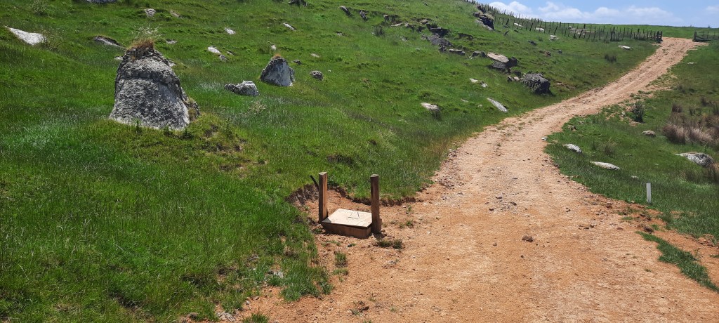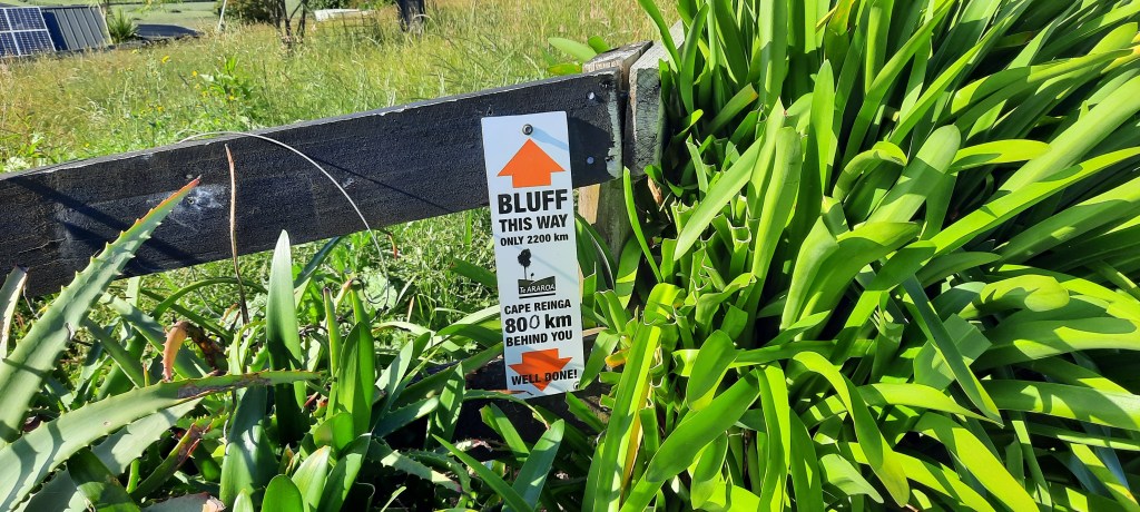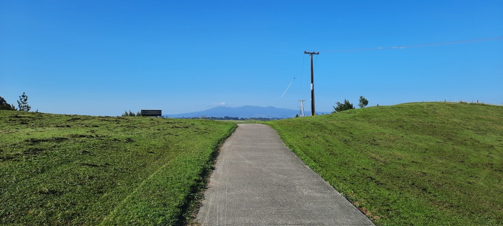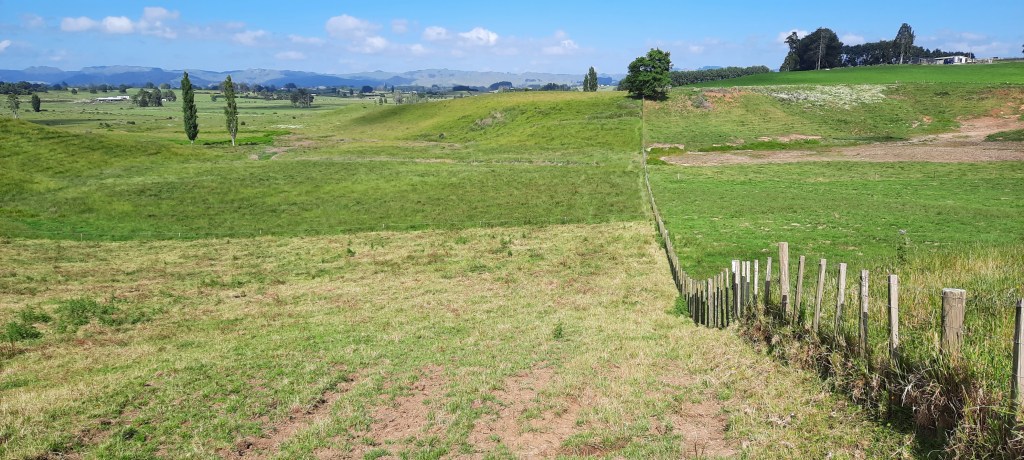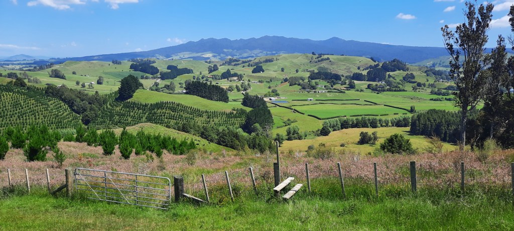 From Tills Landing in Dinsdale the concrete path climbs over a small hill to reveal the first full view of Mt Pirongia in the far distance. Yep it looks really far away. Can I make that in one day I wonder to myself again? Shortly down the road there is a small TA sign congratulating hikers of 800 km accomplished with a mere 2,200 km to go. I’m contemplating the sign when a man emerges from his building site and says it is wrong. He is a section hiker and explains that it was correct when the trail went through the Hunua Ranges. That makes sense as any changes in the route would affect the way markers. At this point now it’s closer to 770 km according to the trail app. A little further on the trail includes the Taitua arboretum, a tree collection that was donated to the council. It is beautifully maintained and has a wonderful array of native and exotic trees in a park like setting. There are many benches and even picnic tables plus also a swag of chickens and roosters. After a short road walk the trail follows a paper road across dairy country. Lots of stiles and crossing through electric fences before reaching the main road leading north into Whatawhata. Fortunately there are some decent berms as the trucks hurtle along this road. At Whatawhata I stop in at the cafe for lunch of coffee panini and a scone. It is before midday so I keep going now with the intention of reaching the campsite.