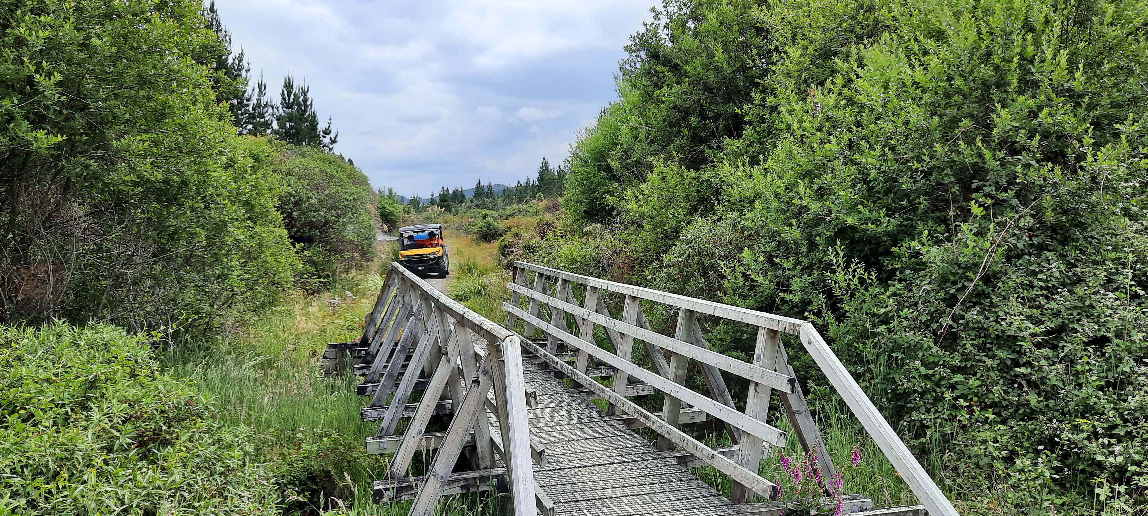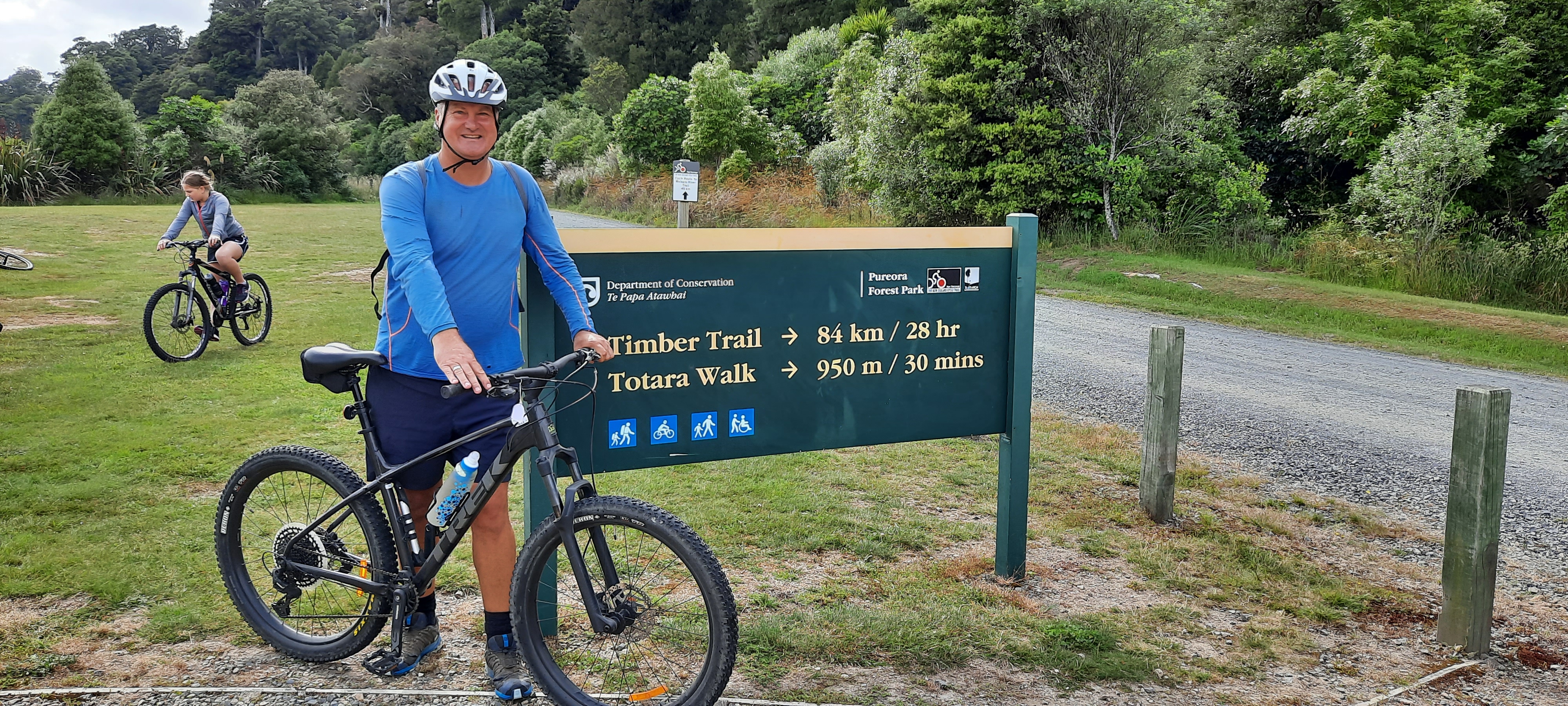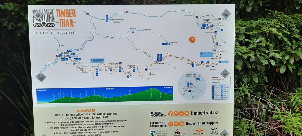 I waited at the entrance to the Timber Trail for my bike to arrive and arranged a small day bag with essentials as my pack will get transferred separately. What a relief not to be lugging it around for two days and to have the convenience of it delivered to Camp Epic today and to the end of the trail tomorrow. Five vans of riders and bikes arrive within minutes of each other. It is much busier than I imagined it would be. The speedsters were soon mounted and off in no time at all. The families and day trippers are less competitive with their departure. Soon I too was off on my 10 speed Trek mountain bike into the bush. And stunning bush it is too. So is the track at this early stage. Here are mighty totara kahikatea tawa rewarewa and a beautiful ground cover of ferns manuka and the like. Shortly we emerge from the bush into a scrub and pine mix before re-entering the bush for the climb on Mt Pureora. The brochure describes this part as a continuous gentle climb. Sustained uphill peddling it sure is. The blim’n electric bikers hum past me as I puff and pant with little progress for the effort expended. The first day is categorised as Intermediate and I think it pays well to heed this when considering the Timber Trail. For instance can you walk 40km in a day? Can you cycle 40km on a rough track that has ascents and very steep downhills? If this frightens you then get an e-bike. It appeared to me that the majority of leisure riders had e-bikes and those comfortable and experienced with mountain biking had their own bikes. The second day is somewhat easier however it is still another 40km. I stop to have a quick chat to Neil who has progressed well. He is nearly at the turnoff to the summit of Pureora which is part of Te Araroa but an optional return walk for timber trail riders. Steve and the Frenchies must already have turned off as I don’t see them. It is with relief that I reach the high point of the trail at 971m above sea level. A little sign in a loose rock cairn denotes the location. Many of the DOC signs are small and positioned parallel to the trail so often I fly by before noticing them. I whizzed past the View of Lake Taupo and the Stump House. It is a magical sight at this elevation of the stunted trees draped in moss. Also a good place to top up water from the frequent streams. The downhill begins, it’s fast and it’s hard on the hands and legs as my body weight is pushing on my wrists and legs. I thought it would be a breeze going down hill but it takes a lot of concentration and energy to keep to the track and not fall off. Far more than I had anticipated. And then WOW you reach the first suspension bridge. The Bog Inn bridge is 115m long, an engineering feat spanning the gorge and allowing you to cycle way above the forest canopy. Soon after is the equally impressive Orauwaka suspension bridge plus there are two more on this section, although smaller they are all impressive. There is still another 15km to ride to Piropiro on undulating track and some gravel road. The land is pumice and gravelly. Cuttings in the high track sides reveal millennia of ash deposits which are all distinctly layered and could be a historical clock for those geologists in the know. To me it is a hell of a lot of volcanic eruptions. Being so close to the old mill town also means regenerating bush and now some pine. Piropiro is now a shadow of its former milling self. There is a catered lodge, a basic DOC campsite and a self catered glamping camp where I pull into at 3pm. It has taken five hours today and I must say I am more pooped than i would have imagined.