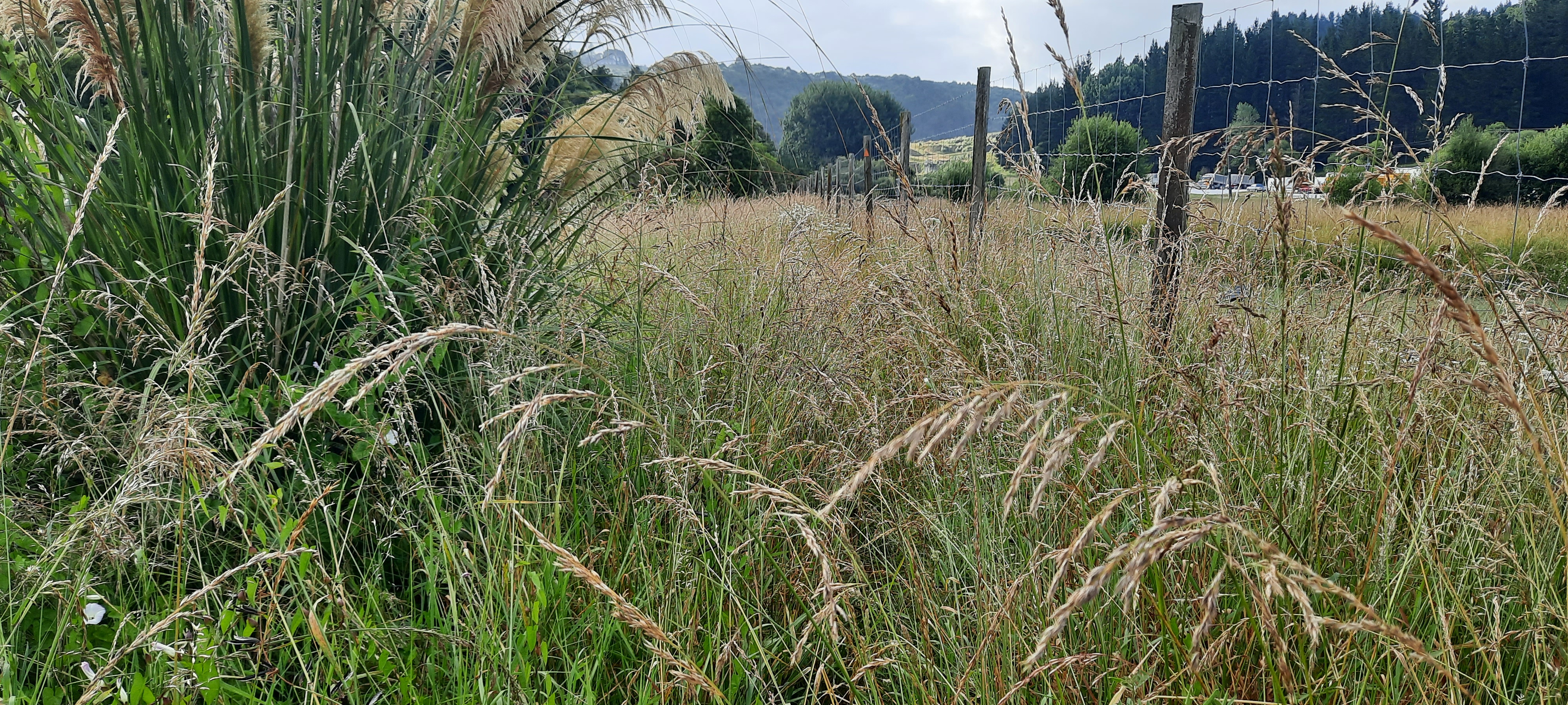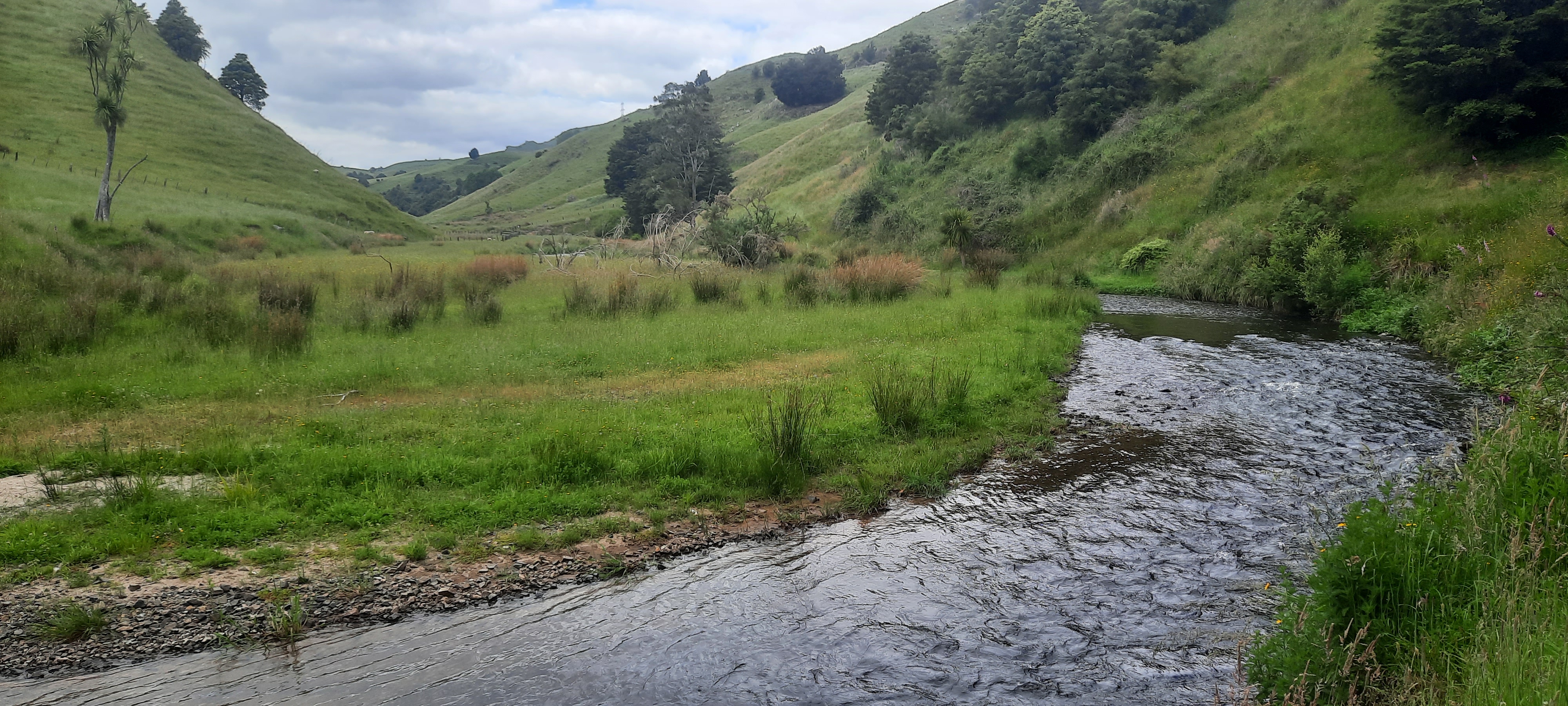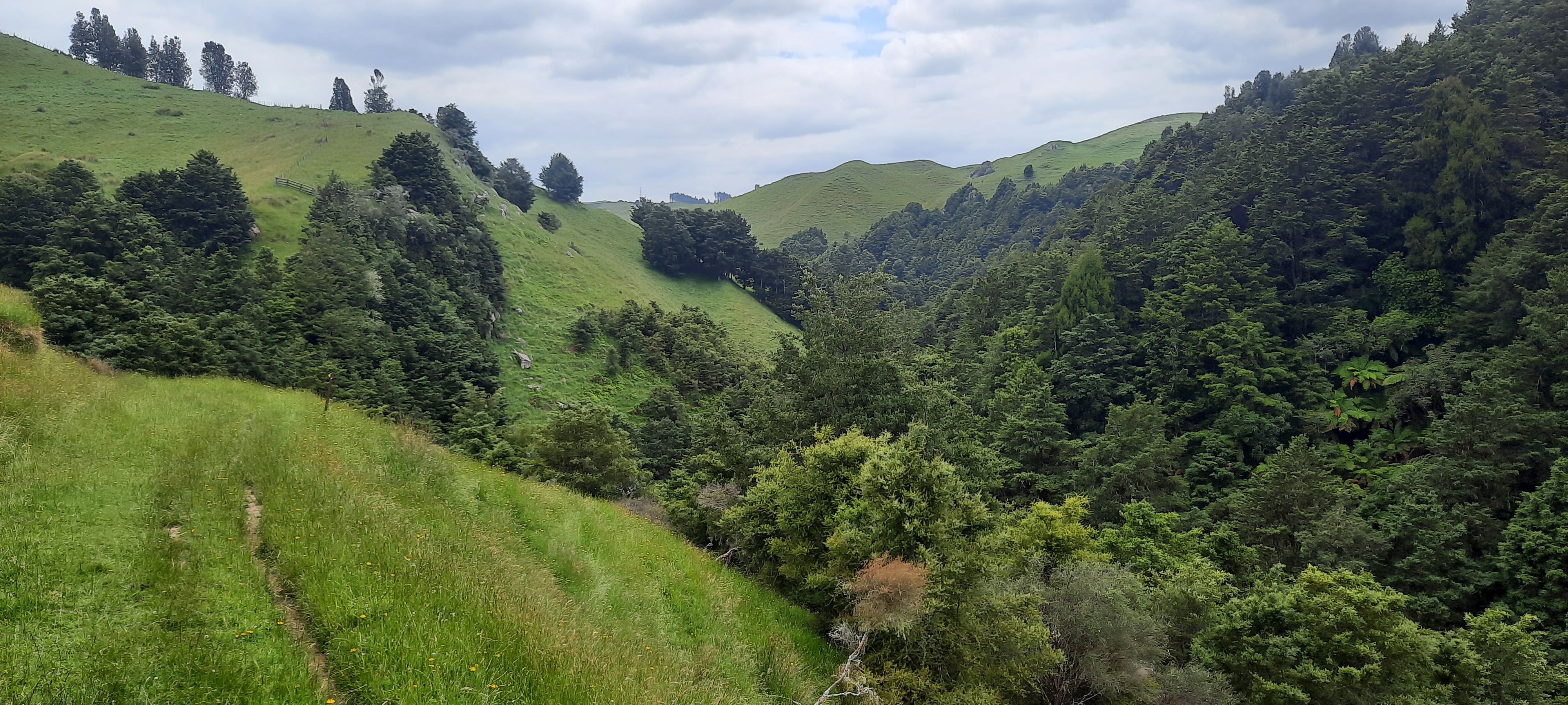This morning I set off from Mel’s place at the decent time of 7:30am as I’m not sure what today entails in terms of duration and trail condition. I have previously read blogs that mention steep sidlings but to what extent I’m not familiar. On the way out of town I take a snap shot of the shearing statue then turn down the nondescript street where the trail commences on the Mangaokewa reserve. The reserve encompasses the stream of the same name which the river trail will follow alongside for 13 km. After a dubious start with overgrowth vegetation, the stream is bridged and the trail passes by remains of quarries which are on both sides and are impressive scars on the landscape. The track through the bush is so enjoyable. There are picturesque waterfalls and lots of tree cover. Kawakawa seems to like this environment as it is prolific and there are many enormous kawakawa plants that could almost be trees. I’m on the hunt for its ripe fruit. You look for the soft yellow cylindrical cone. Green ones are not ripe. But you have to be quick as the birds love them. I can’t really describe their taste exactly as its not like anything else; its soft and sweet initially and changes quickly to a umami flavour. I did manage to find a couple of yellow ones from the female plants. A swing bridge takes you into the reserve parking and camping area. I waved to the lone campervan guy but saw that some little huas had set fire to one of the park benches and there were broken bottles littering the ground. Later at camp the Frenchies said that some youth in 4wd vehicles had been partying and drifting until 2am. The reserve continues following the stream on a path between the tawa kahikatea and totara trees. For this first section it is easy walking and would make a lovely outing destination with the trees and stream beside. Upon reaching a set of stairs it quickly changes to the type of track we’re more familiar with on the TA. Think mud tree roots slippery grass gorse blackberry bushmans lawyer rocks stiles thistles and a track that goes up and down for no apparent reason. This was pretty much what the day was like. A “goat track” as Neil said when he arrived at camp this evening. I think we all got lost off trail today. The Frenchies Lucy and Baptiste had a big diversion and had to retrace to the last orange marker. Steve and I did the same mistake and followed a sheep track that sidled a steep bluff rather than climb up and over. This resulted in a steeper climb for both of us in order to rejoin the trail. There were many sidlings and ample opportunity to slip down or over. The hiking poles came in very handy today as extra limbs to steady and support. However with one slip I thought I had done something dreadful to my right achilles as it panged in pain. Fortunately by the evening with rest it feels better so perhaps it released tightness in my leg instead. I will find out tomorrow once I set off walking again.