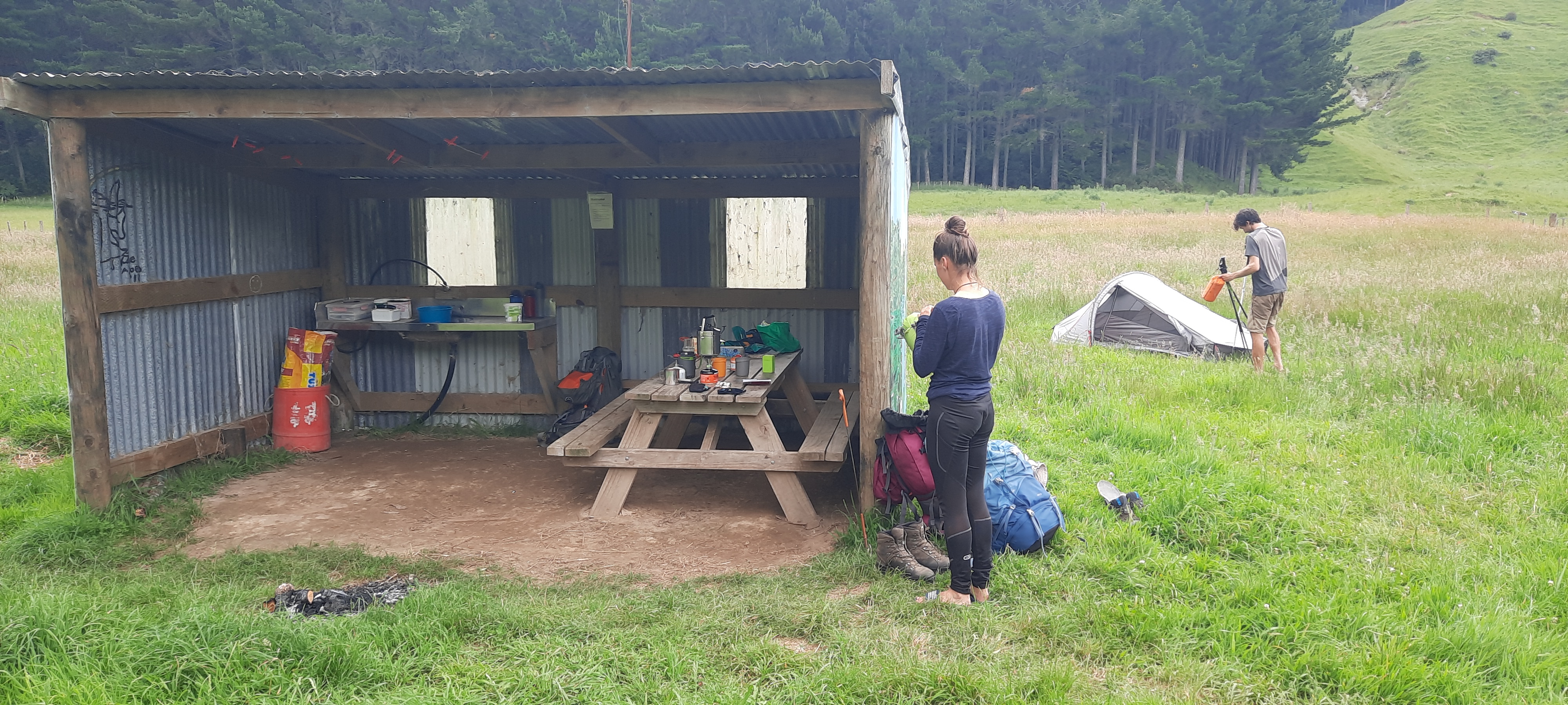 It wasn’t all bad by any means. I’m enjoying the smell of the honeysuckle in the mornings as I did today. The virgin bush was magnificent especially after having been through so many regenerating forests and there were many opportunities to refill the water bottle from small streams or wee waterfalls that crossed the trail. I suppose some may have fed through the farmland above but many were fresh from the limestone hills above. It was a relief to cross a stile and see a sign indicating that the camp site was only 2.8km more to walk. This walk did include a long prickly corridor of gorse and negotiating a paddock of Angus steers but eventually I dragged my tired body into the campsite. It is provided by the generous farm owners for TA hikers and had a long drop, clothes line and a shelter for dining with fresh water. All for $5 which at the end of a long day is nothing. In regular times I wouldn’t be seen dead in such a site but today and for hikers it may as well be the Ritz. Steve is already here and set up. The Frenchies pull in about half an hour after me and Neil arrives around 6pm. That’s our contingent for tonight.