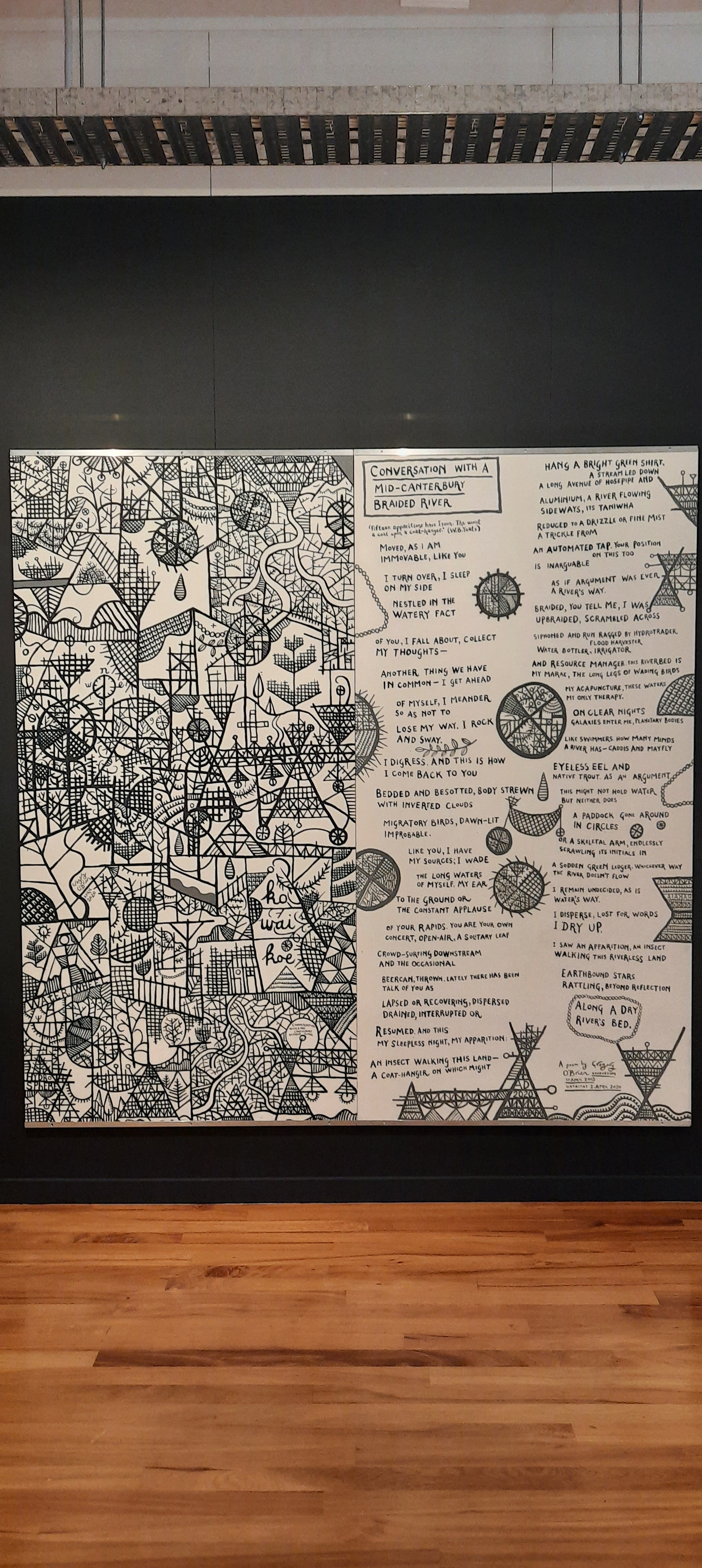 We also paid a visit to the Sargeant Gallery. I particularly liked the Wai exhibition and the artwork by Gregory O’Brien “Conversation with a Mid-Canterbury braided river” as if one could personify a river and have a good ole chin-wag. What would a river say? It’s a fun concept. This evening we greet arrivals off the river Kas Rob Slane Mandy and Max. Plus JoJo walks past the restaurant where we are having dinner. In fact we ate at Caroline’s Boatshed both nights we were in Whanganui.